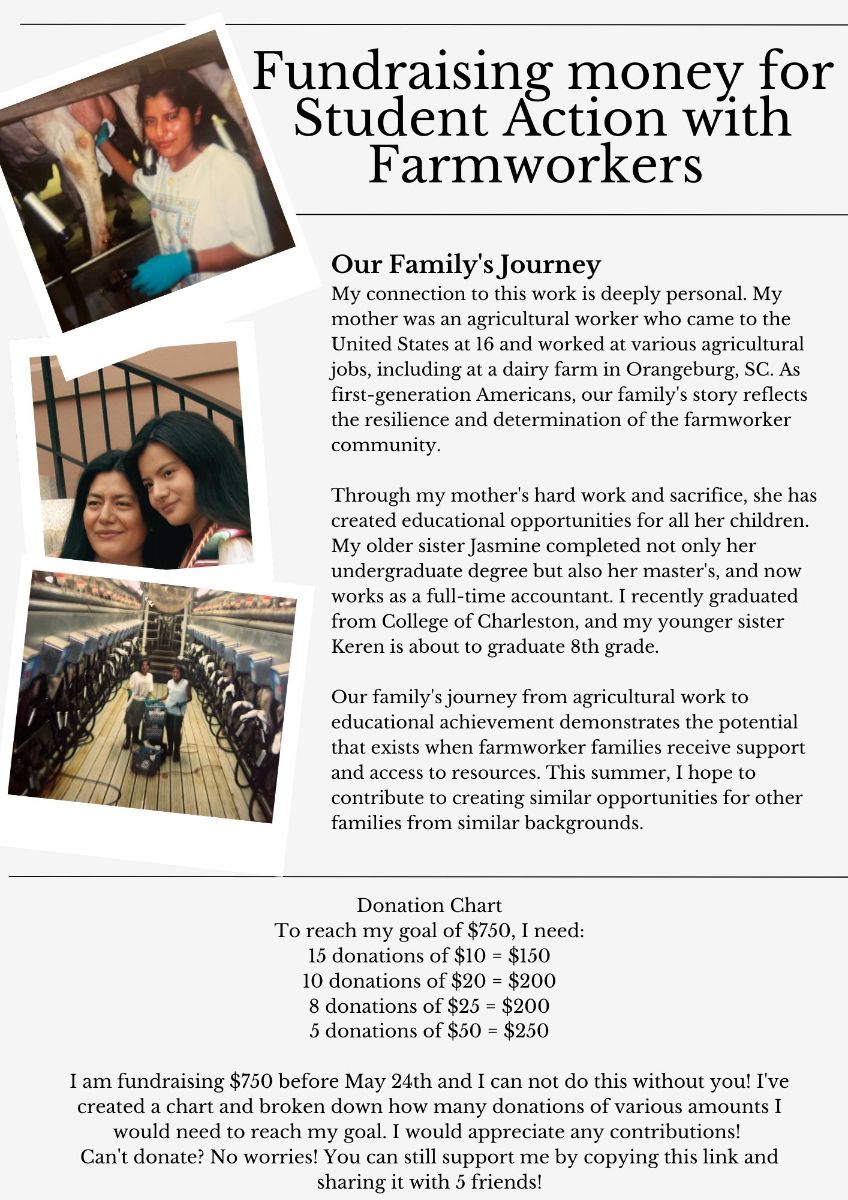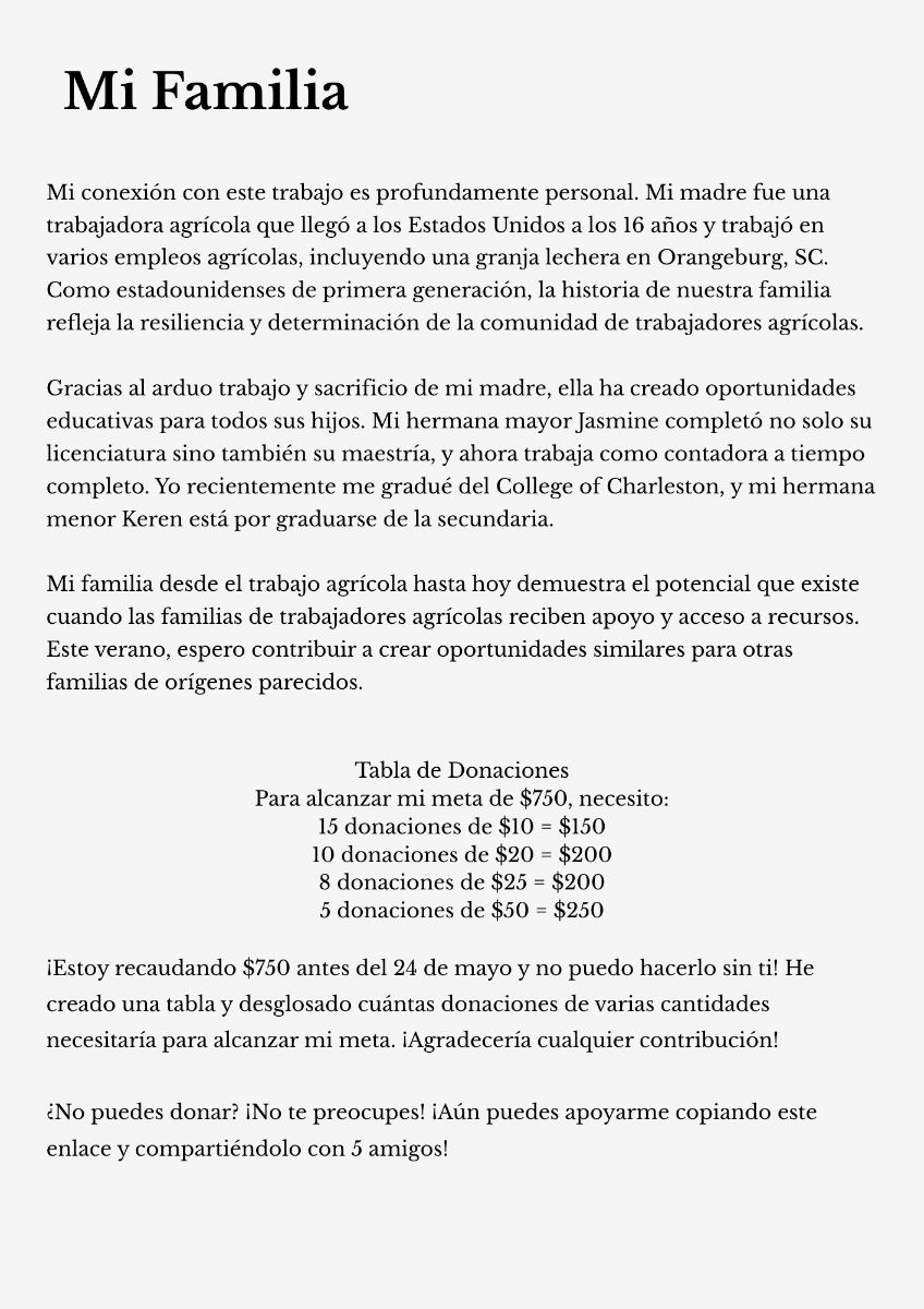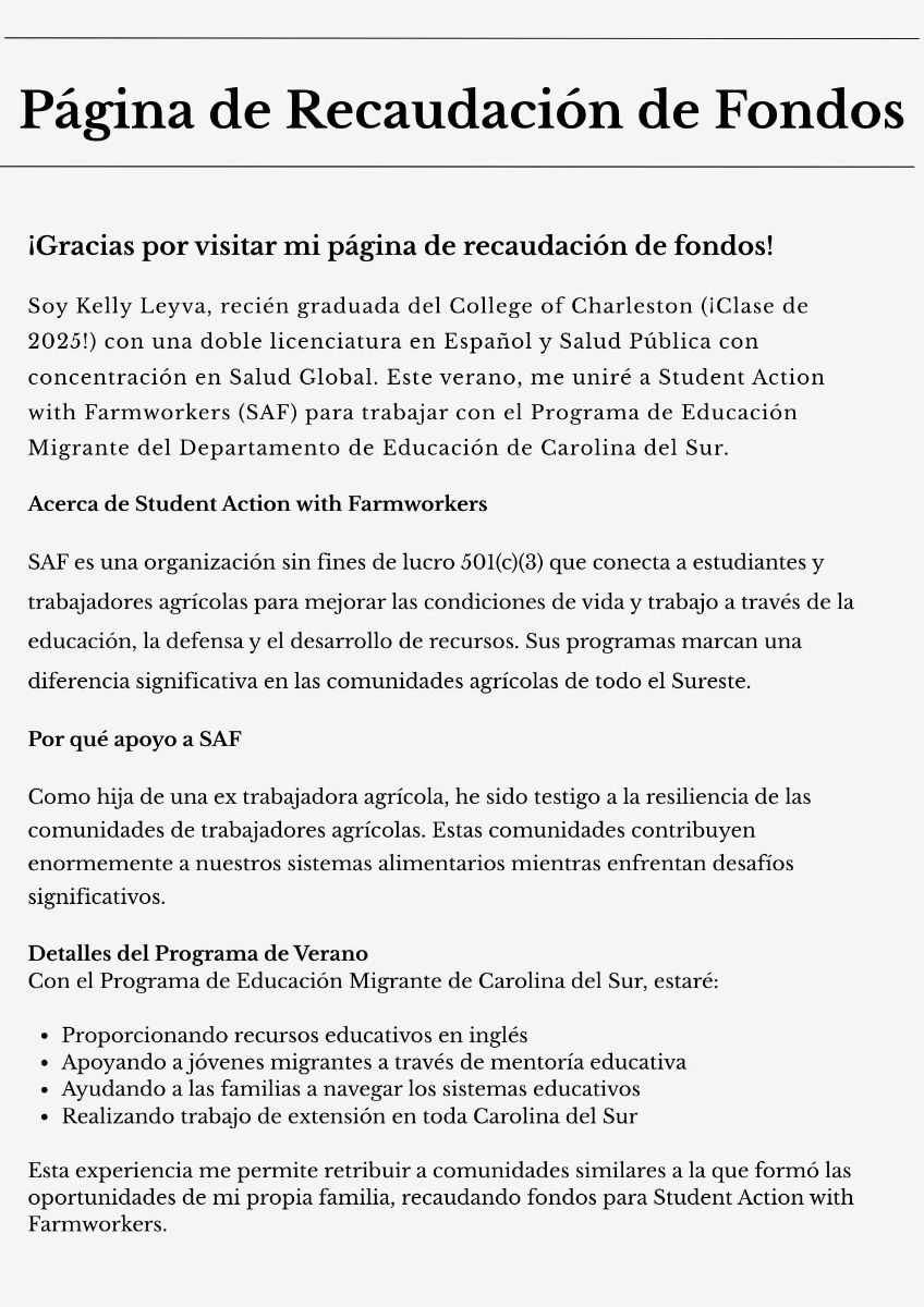 | Aaron O'Brien | 05/25/2025 | $21.02 | Kelly, you're a rockstar! Keep up the good work :) | Madison Springs | 05/22/2025 | $21.02 | So glad that you will now be a part of the fabulous SAFistas! Can’t wait to hear about all the great work you will do this summer! | Esther Leyva | 05/21/2025 | $25.00 | Felicidades Kelly! | David Vela | 05/21/2025 | $40.00 | 😁 | Ana Leyva | 05/21/2025 | $100.00 | un orgullo que seas mi sobrina, tu puedes 💝 | Daniel & Maria Family | 05/21/2025 | $100.00 | buen trabajo kelly 🤍 | Cirilo Leyva | 05/21/2025 | $30.00 | excelente trabajo, sigue adelante con muchas ganas! | Cecilia Trejos | 05/21/2025 | $5.53 | Santiago Leyva | 05/21/2025 | $100.00 | excito en todo lo que hagas | Christina Garcia | 05/21/2025 | $26.21 | Shaon Lahiri | 05/20/2025 | $104.74 | An excellent cause and important work. Proud of you! | Rochelle Altman | 05/20/2025 | $20.00 | Congratulations on your accomplishments at CofC! | Jose Chavarry | 05/20/2025 | $26.21 | Felicitaciones Kelly, excelente trabajo. | Claudia Bautista Perales | 05/20/2025 | $52.01 | Michele Owens | 05/20/2025 | $10.70 | I wish you well my dear! I love how you enjoy helping others, its a great gift, ...never loss it!!! | Anonymous Friend | 05/20/2025 | $21.04 | Tawana Philpott Brown | 05/20/2025 | $25.00 | Carmen Grace | 05/20/2025 | $26.21 | ¡Enhorabuena por todos tus éxitos, Kelly! Fue un placer tenerte en nuestro departamento. | Kimber Bates | 05/20/2025 | $21.04 | Hisp is so proud to have such an outstanding student!! | Anonymous Friend | 05/20/2025 | $52.01 | Fernando Leyva | 05/20/2025 | $21.04 | Susan Divine | 05/20/2025 | $26.19 | I'm so proud of all that you've done and excited to see all that you will do! | Meg Dobbins | 05/19/2025 | $21.04 | William Spencer | 05/19/2025 | $31.35 | :) | Keisha Gonzalez Diaz | 05/19/2025 | $7.59 |