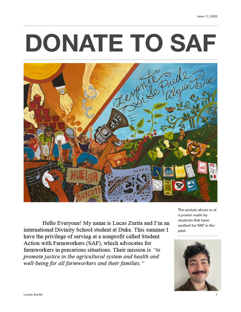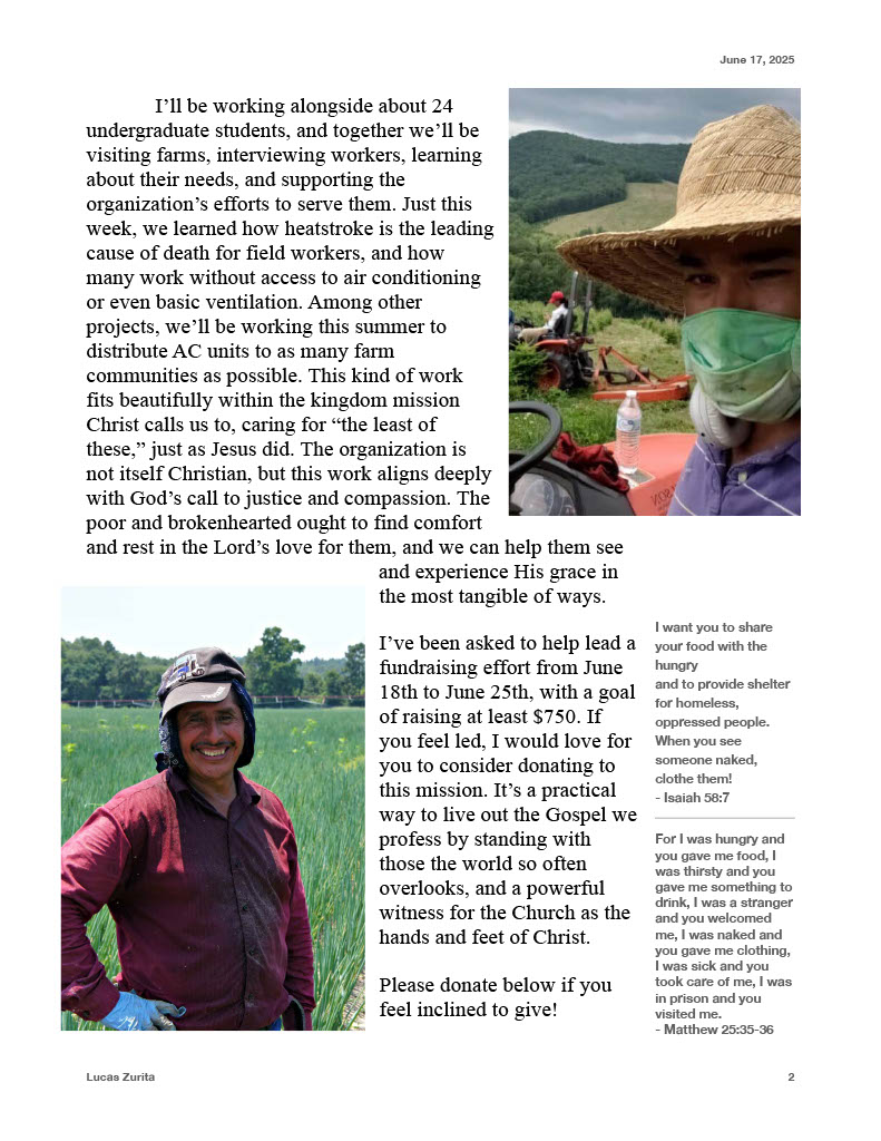 | Elizabeth McQuaid | 07/09/2025 | $20.00 | "sweet as" praying for your summer ministry, Lucas! | Kara Griffith | 07/01/2025 | $304.29 | We are so thankful to support Student Action with Farmworkers. Thank you for the important work you do. Christ Our Life Church | Susan Finch | 06/23/2025 | $100.00 | In the name of Christ | Anonymous Friend | 06/23/2025 | $26.21 | I see the birds... up in the air 💛 | Andrew Darragh | 06/21/2025 | $25.00 | This is awesome work you are doing. | Anonymous Friend | 06/19/2025 | $155.46 | Tomatillo | Lucas Zurita | 06/18/2025 | $10.00 | Christopher and Caroline Hiler Albert | 06/18/2025 | $104.74 | We love you Lucas. Keep up the gospel work! | Brant Copen | 06/18/2025 | $200.00 | Such a great mission! | Adam Benson | 06/18/2025 | $25.00 | Lori Maurais | 06/18/2025 | $250.00 |